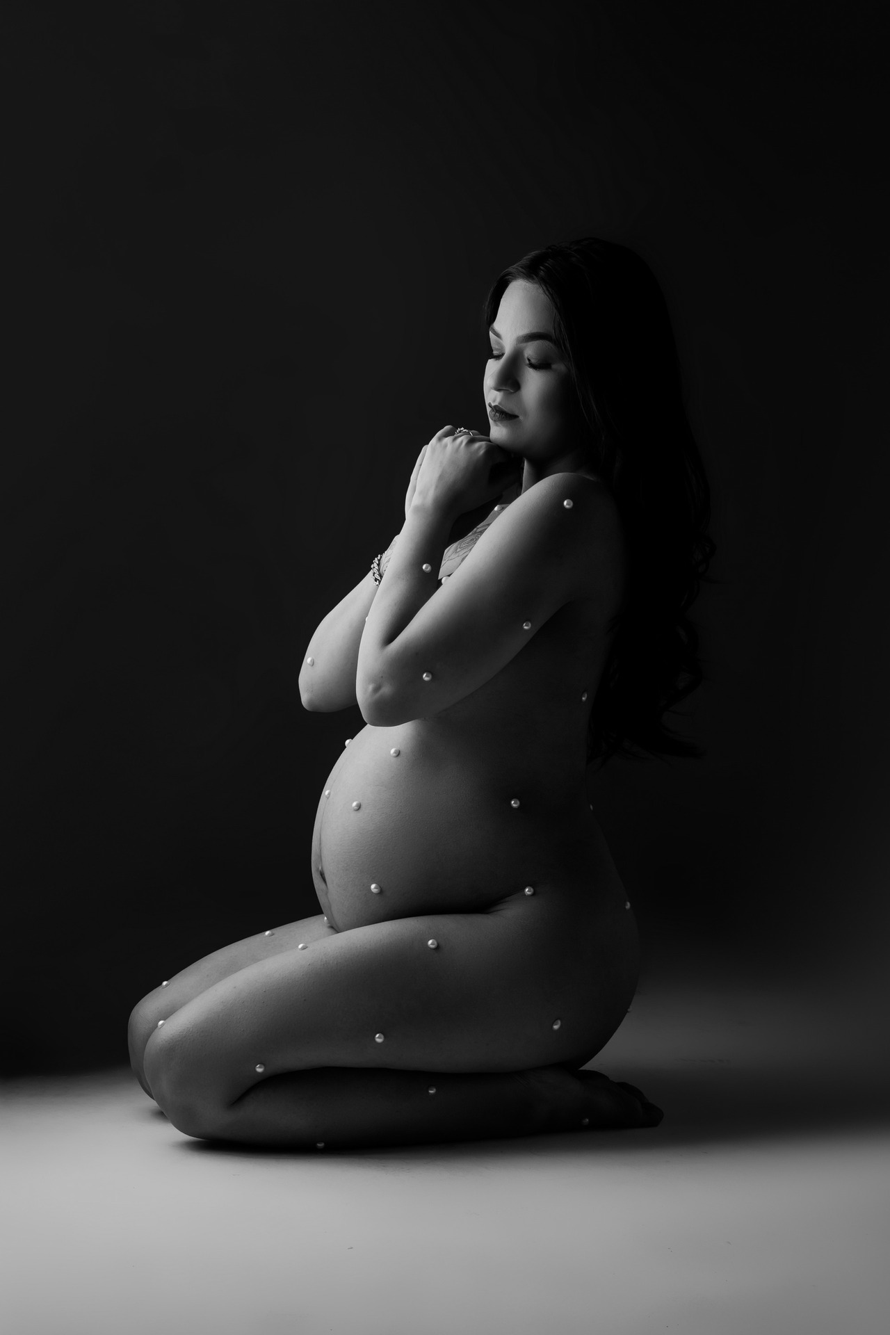 As pérolas criam pontos de luz e textura, destacando o corpo de forma elegante e artística, e dando às fotos um visual moderno e fora do padrão.
